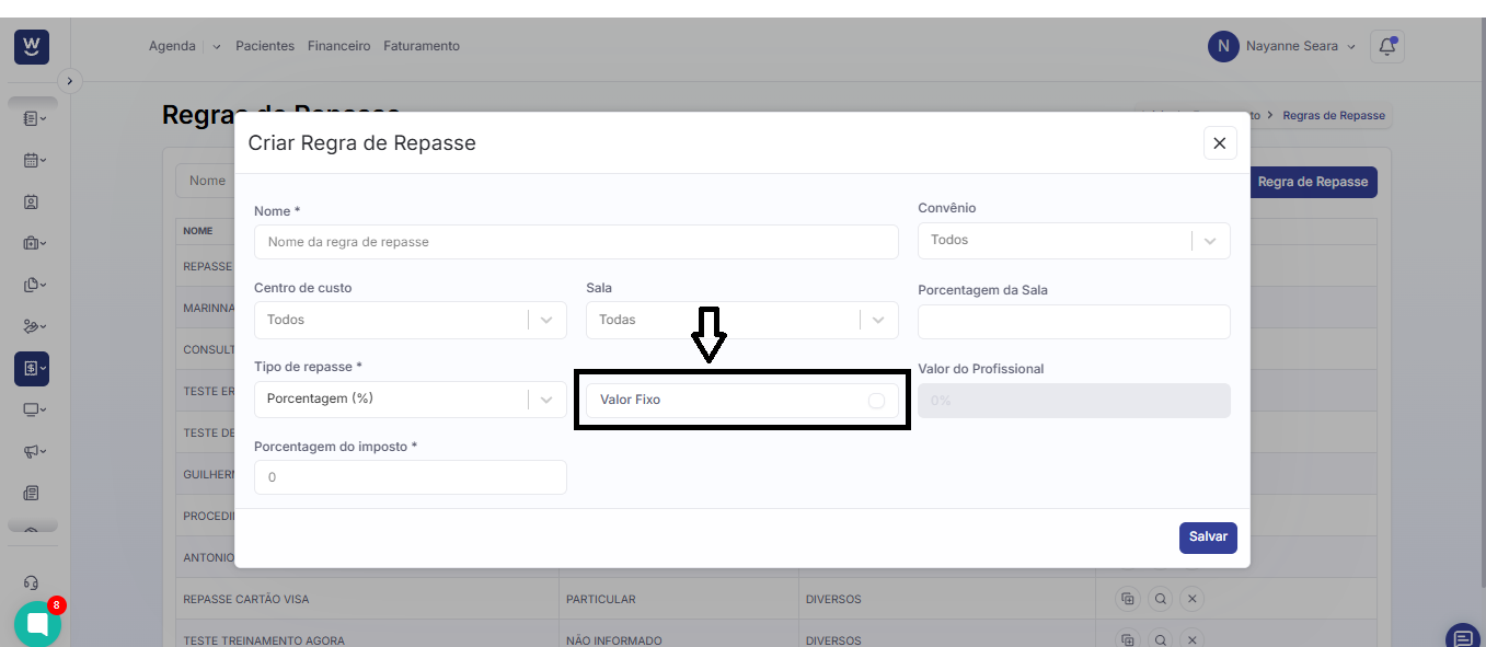 Marque essa opção caso o repasse seja o mesmo para todos os procedimentos vinculados a essa regra. Por exemplo, se todos os procedimentos (como consulta, tomografia e ultrassonografia) tiverem o mesmo percentual ou valor de repasse, como 60% para o profissional, o campo “Valor fixo” deve ser marcado.