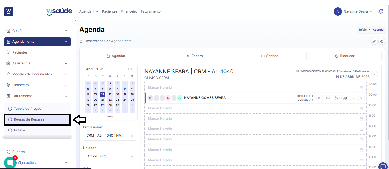 Na tela inicial do WSaúde, clique na seta localizada na parte superior esquerda da tela, ao lado do nome “Agenda”.