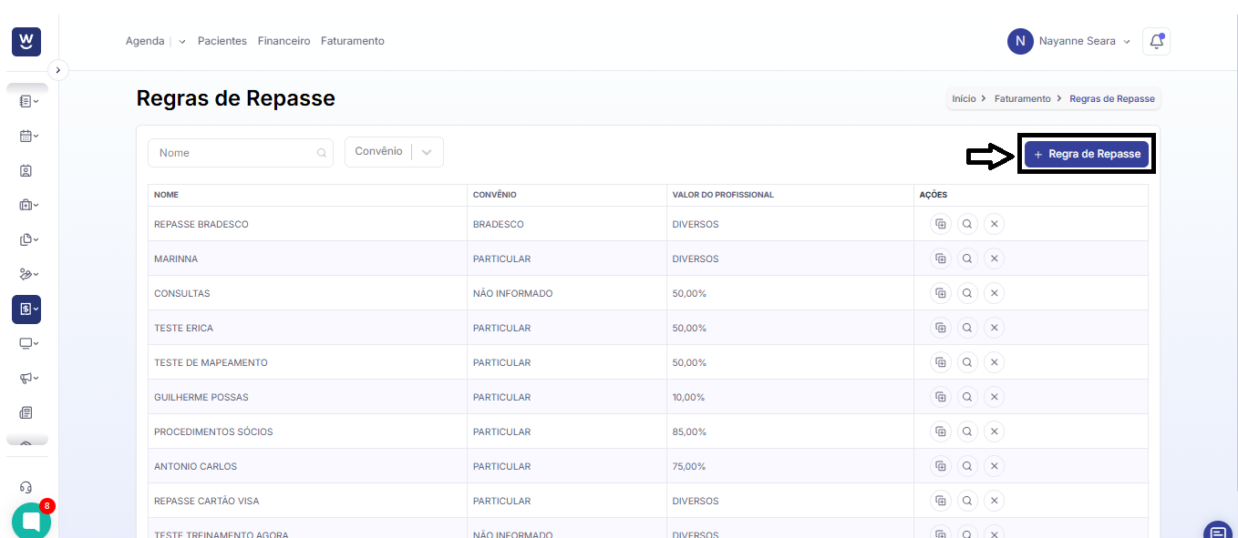 Ao clicar em “Faturamento”, três opções serão exibidas. Clique em “Regra de repasse”. Você será redirecionado para outra página.