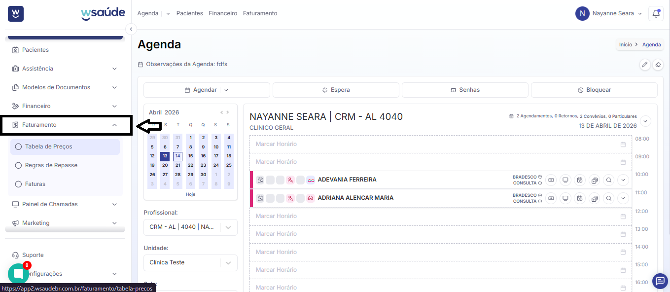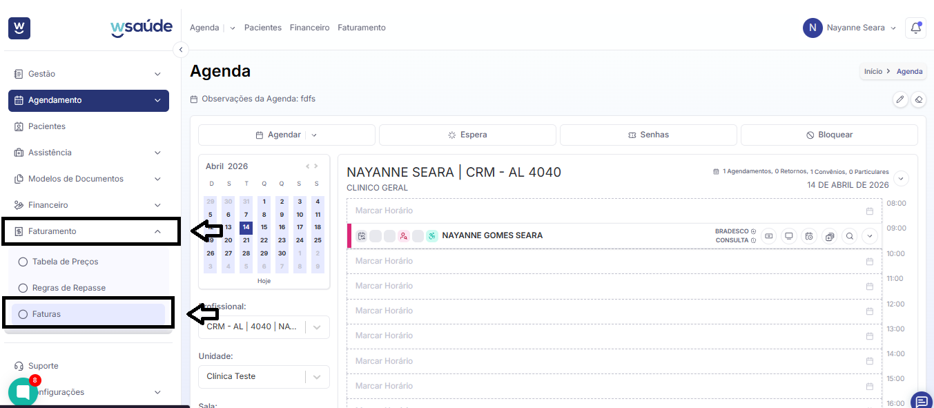 Na tela inicial do WSaúde, clique na seta localizada na parte superior esquerda da tela, ao lado do nome “Agenda”.