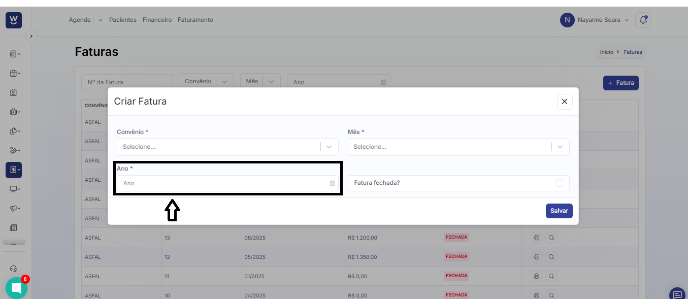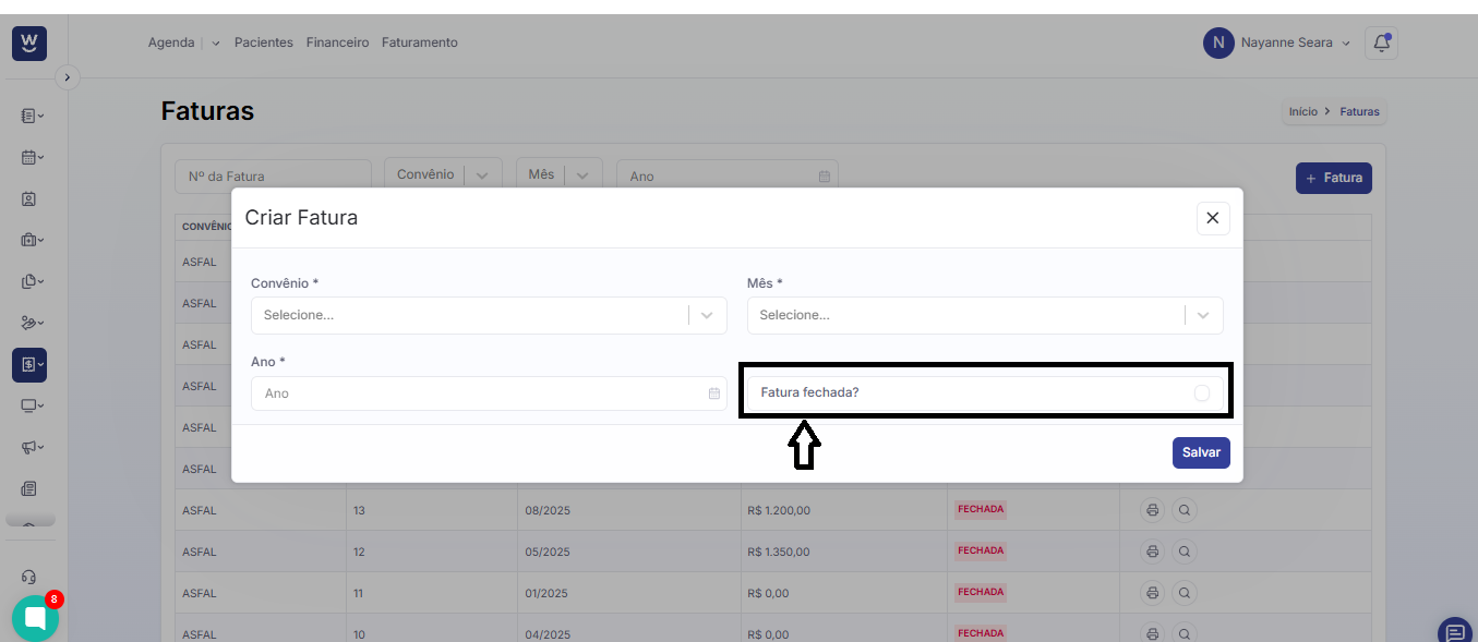 Caso você esteja abrindo uma fatura que já foi encerrada, marque o campo “Fatura fechada?”. Caso contrário, deixe esse campo em branco e clique em “Salvar”.