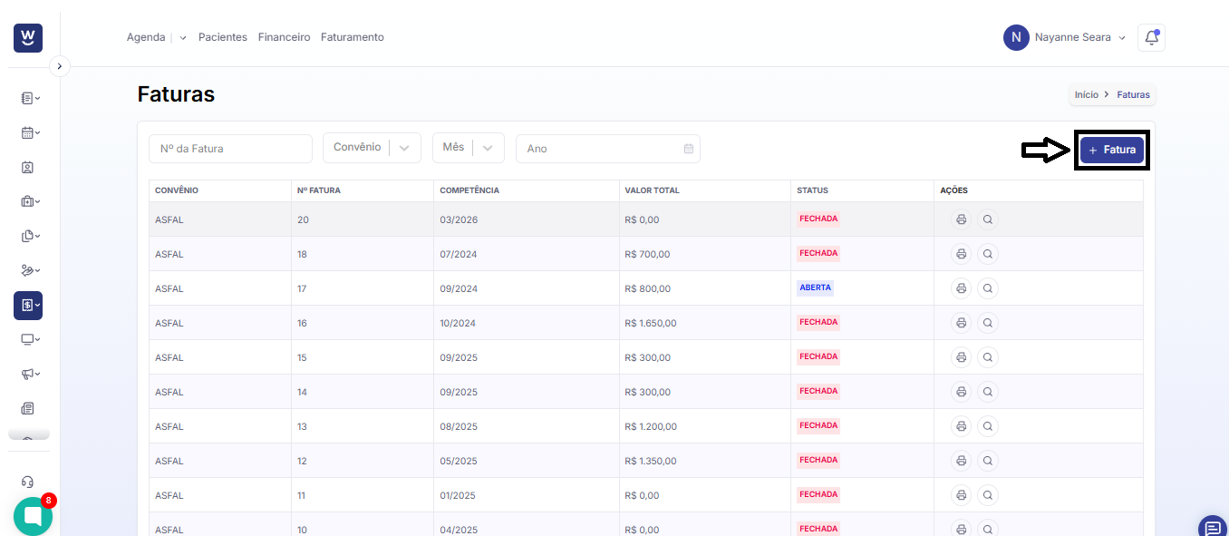 Na janela que se abriu, clique em “+ Fatura” para iniciar a abertura de uma nova fatura.