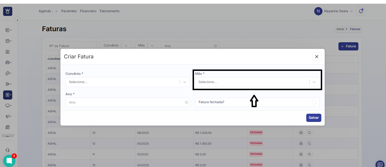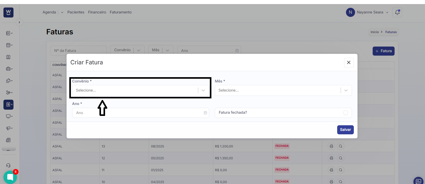 Após clicar em “+ Fatura”, uma janela de “Criar Fatura” será exibida na tela. Nela, você deve informar para qual convênio deseja realizar a abertura dessa fatura.