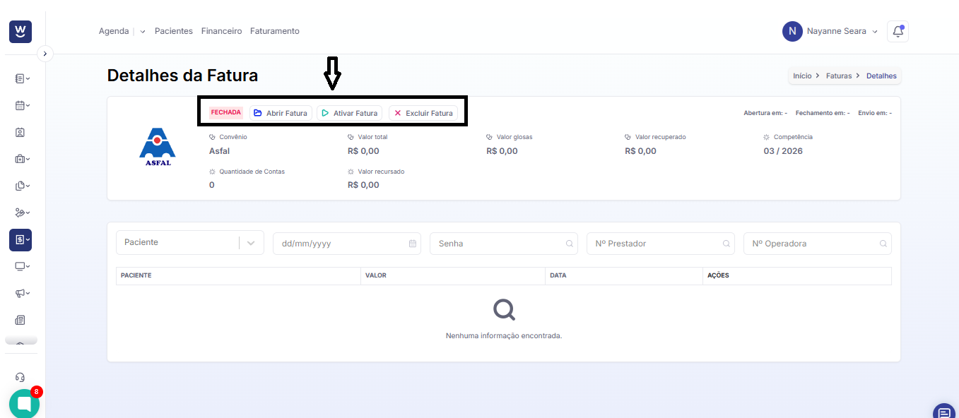 É importante manter sempre uma fatura aberta para cada convênio. Isso porque os procedimentos lançados só serão vinculados a uma fatura quando houver uma fatura aberta. Caso contrário, o procedimento lançado não ficará vinculado a nenhuma fatura.